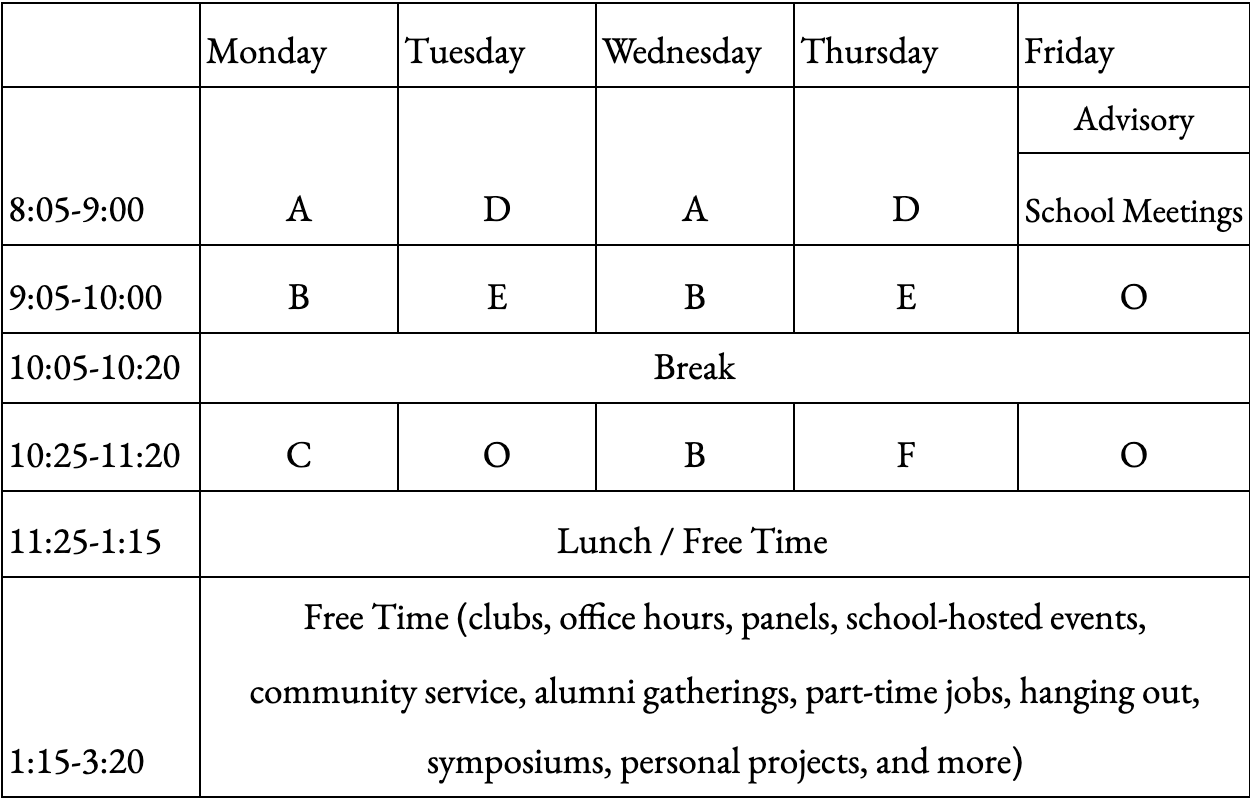 Furthermore, discussions, mentorship programs, individual studies, and part-time jobs – activities that would develop real-world skills better than any sandboxed class would – could finally come to life and have dedicated time to take place. Therefore, rather than waiting for summer vacation, when everyone is scattered across the globe, students could engage in long-term projects throughout their high school years. This way, students would develop the key skills of self-agency, collaboration, and impact throughout our high school careers.